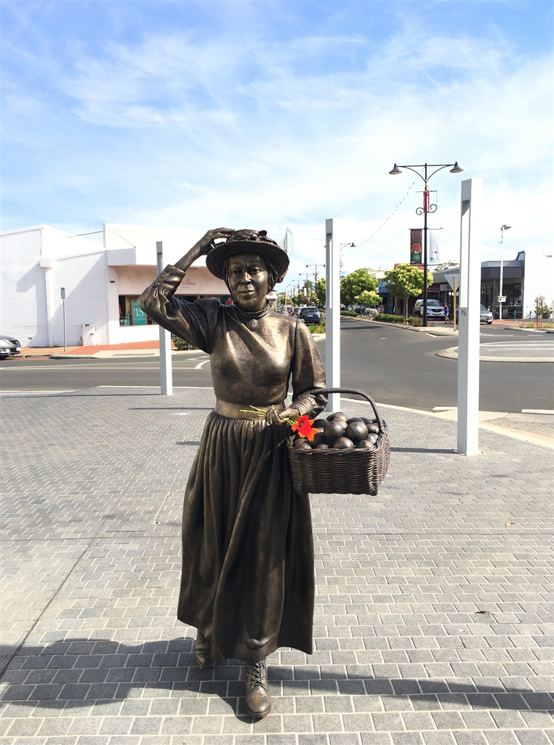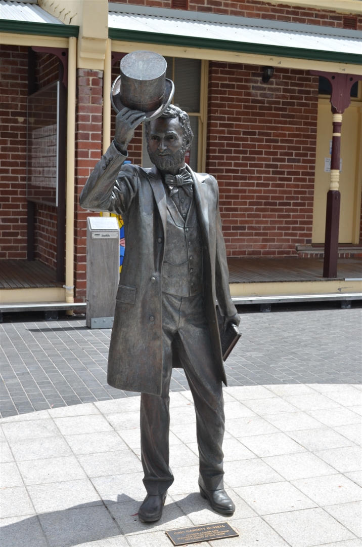 John Garrett Bussell explored The Vasse area with surveyor Robert Edwards, looking for better soil and land. The sculpture represents the four families which founded the town: brothers Henry and James Chapman, George Layman, Elijah Dawson and brothers John, Charles, Vernon and Alfred Bussell and their maid Phoebe Bower. Phoebe Bower was the first woman to live in the district and a small plaque installed in her honour, can be found on the flag pole in Victoria Square.
