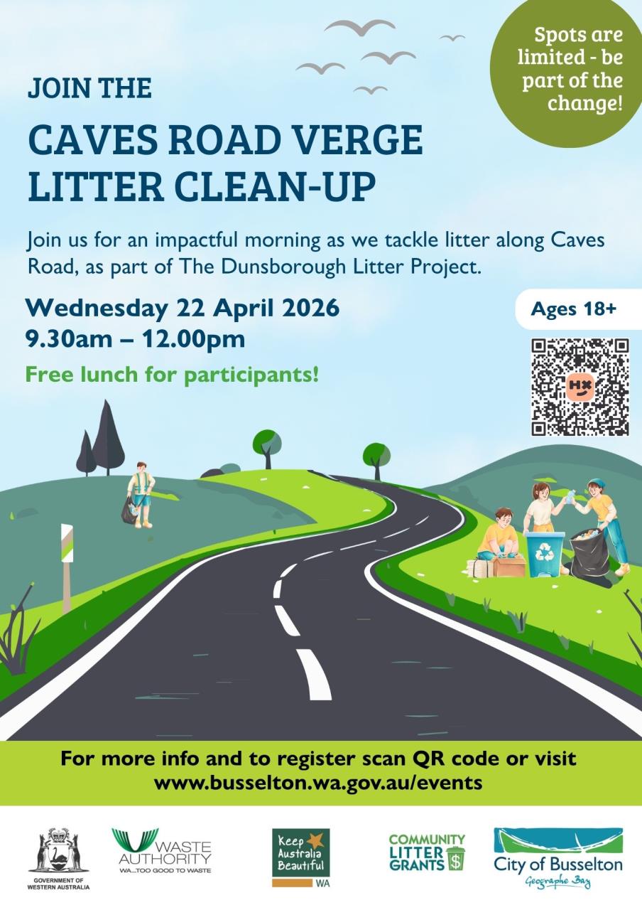This community-driven project is about reducing local litter through education and action. The City of Busselton is inviting volunteers to participate in safe litter collection along roadsides in order to quantify the amount and types of roadside litter and encouraging long-term behavioural change to reduce future littering.