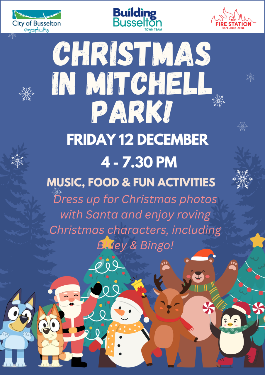 Building Busselton Town Team's annual Christmas family event in Mitchell Park with Father Christmas and roving Christmas characters including Bluey and Bingo! A Christmas mix of activities, musical entertainment and party food stalls. Families will meet Father Christmas in his sleigh, our Xmas photographer, the Sugar Plum Fairy and plenty of elves. There will be activities for families including photos on the Xmas bench, writing letters to the North Pole, face painting and Christmas craft.