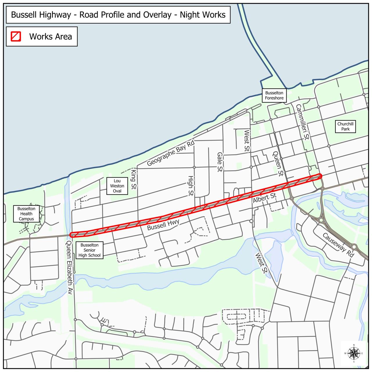 Following the consultation process with affected properties in September 2025, the City of Busselton is proceeding with the delivery of road resurfacing works on Bussell Highway (between Queen Elizabeth Avenue and Queen Street), Albert Street and Harris Road (between Queen Street and Camilleri Street), and Queen Street (between Albert Street and Peel Terrace).