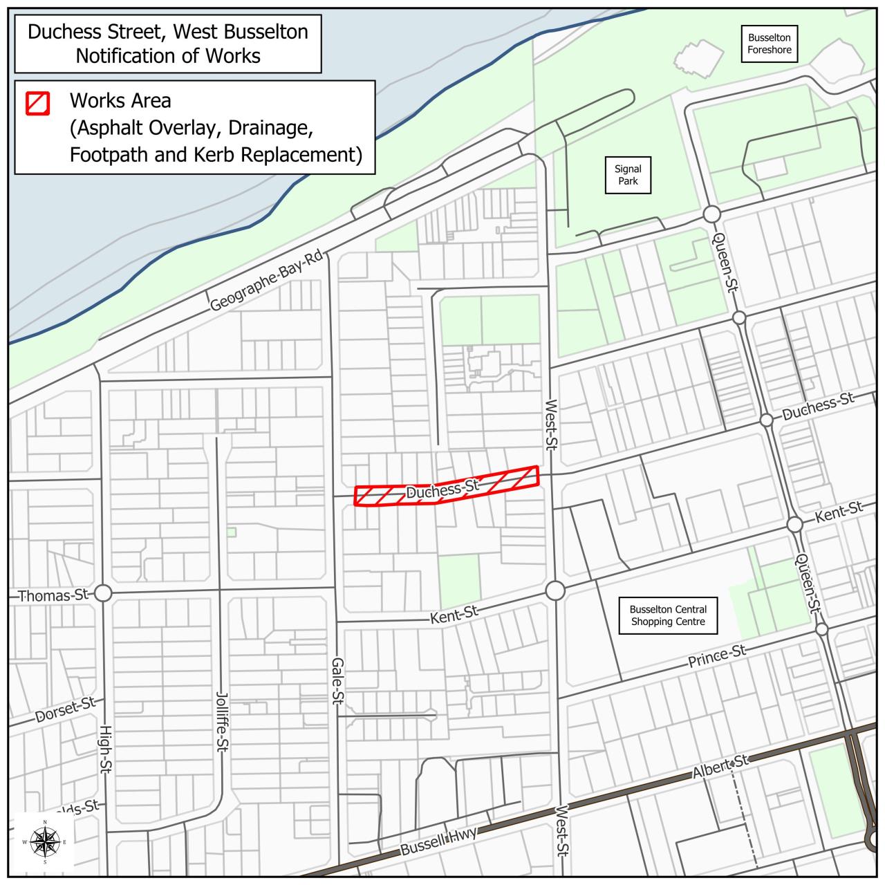 The City of Busselton will be undertaking road resurface works on Duchess Street, between Gale and West Street.