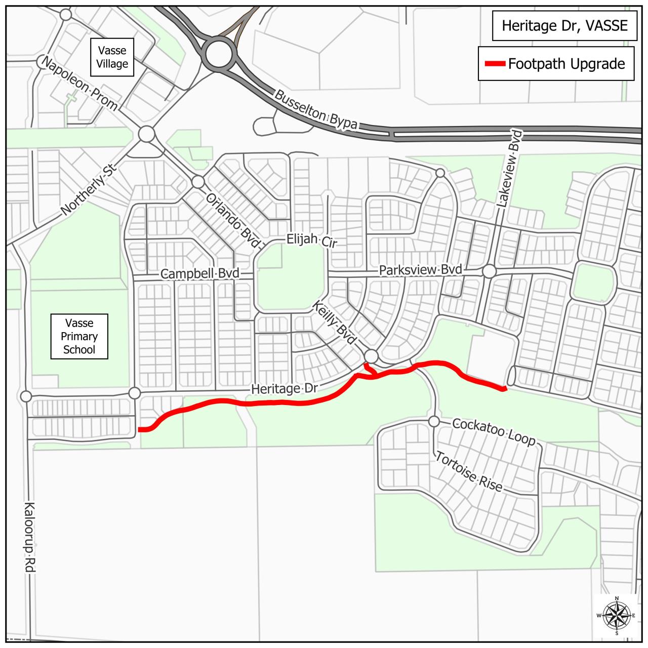 The City of Busselton wishes to advise that works will be undertaken within Reserve 49273 along Heritage Drive, Vasse. The project involves upgrading the existing section of footpath from Pearson Drive, travelling east towards Tortoise Rise and ending at Oaks Drive.
