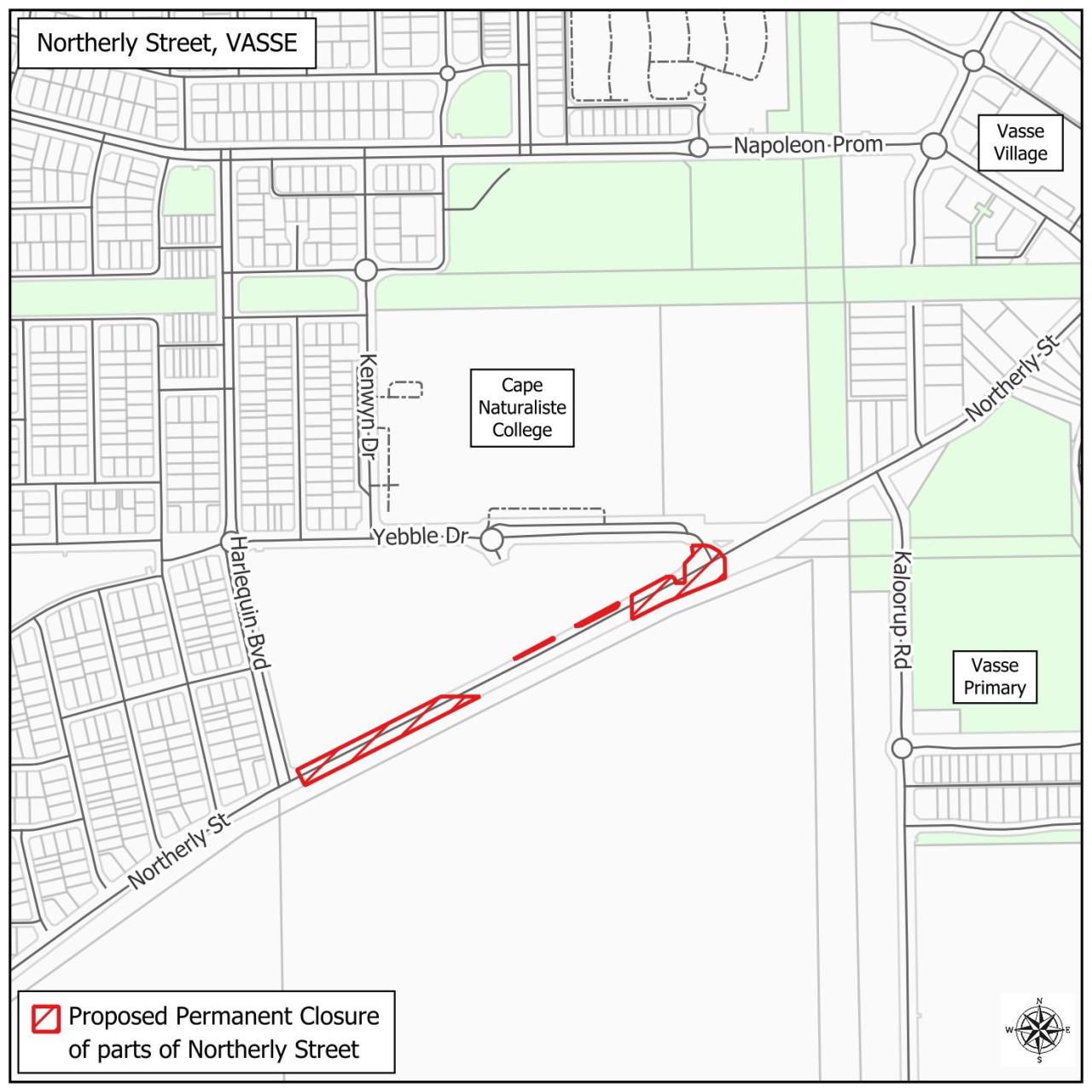 Referring to the map, several parts of Northerly Street are proposed to be permanently closed between Harlequin Boulevard and Yebble Drive, Vasse.